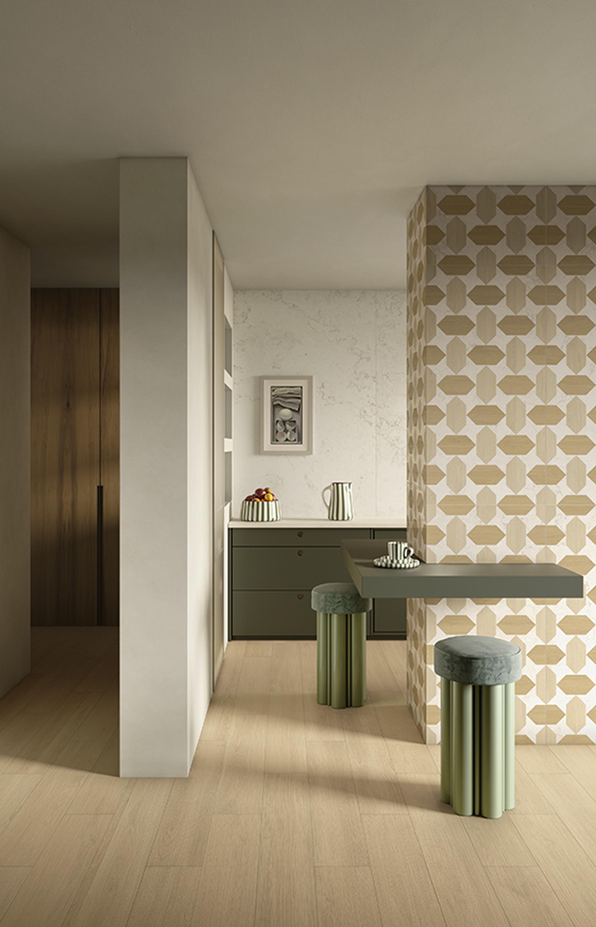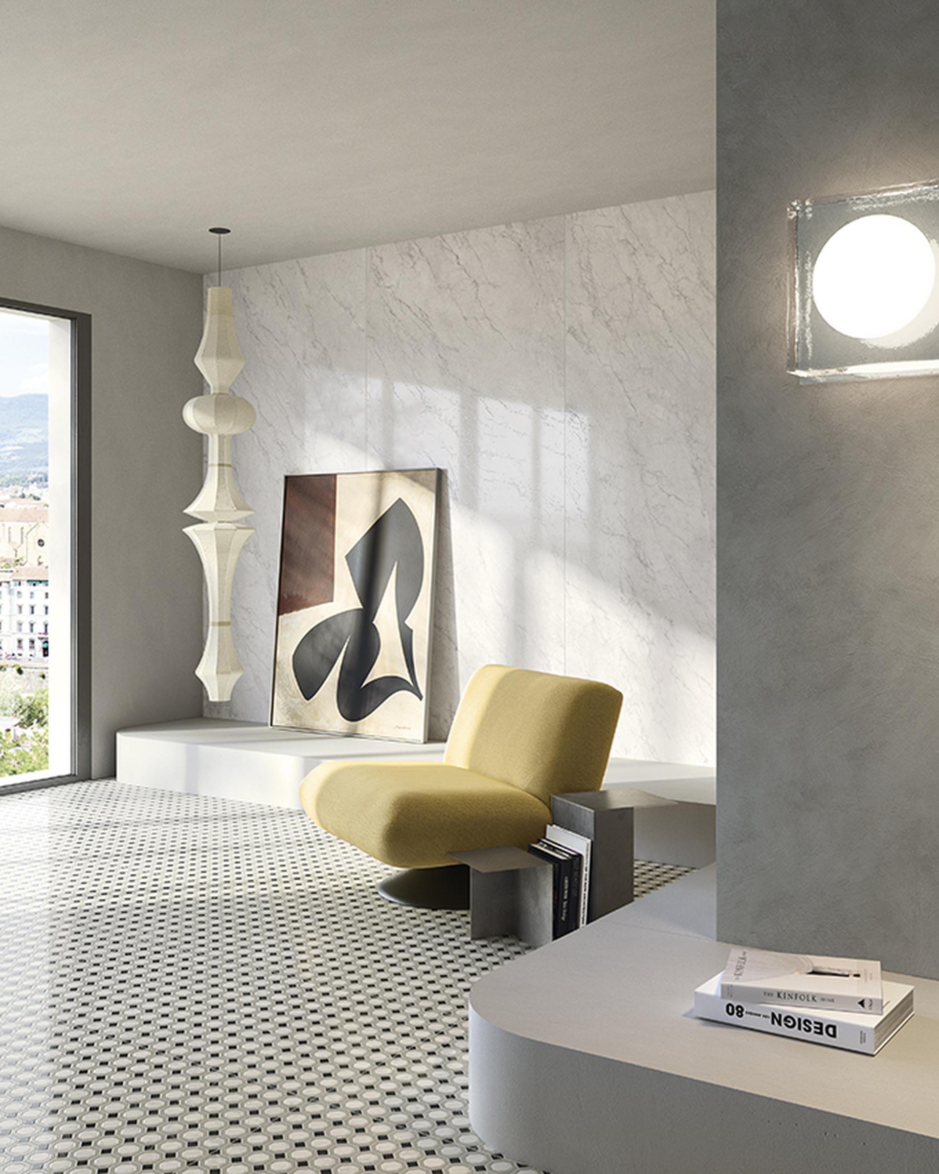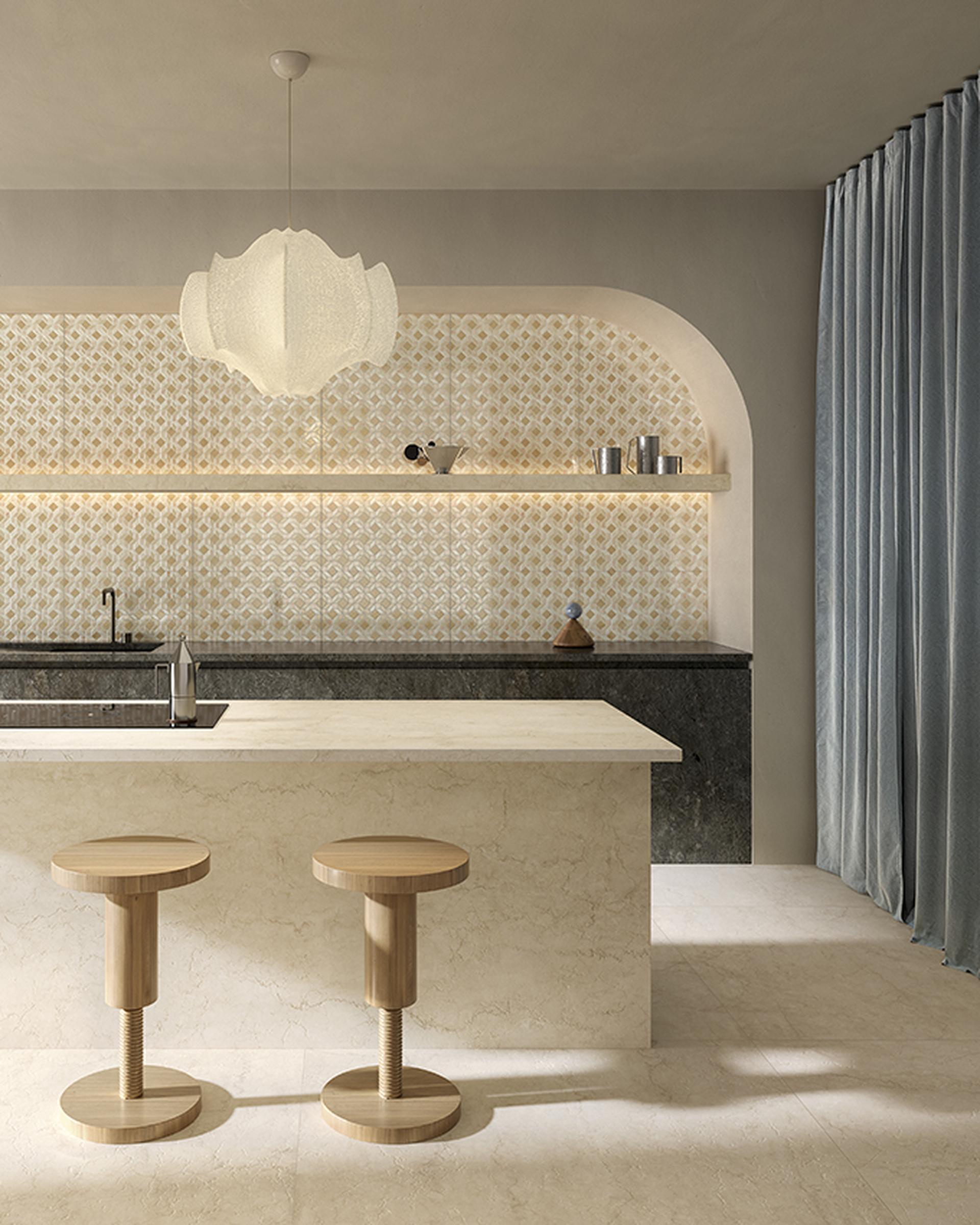 Современный стилистический акцент приглашает к экспериментам с сочетанием материалов. Carrara, Biancone, Perlino и Botticino формируют палитру Bon Ton, представленную в четырёх вариантах поверхности: Lux3D, Soft3D, Antique3D и Natural 3D.