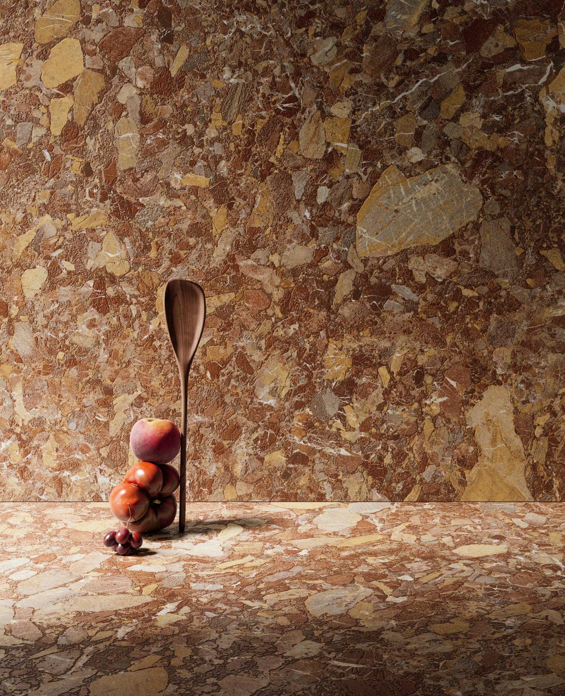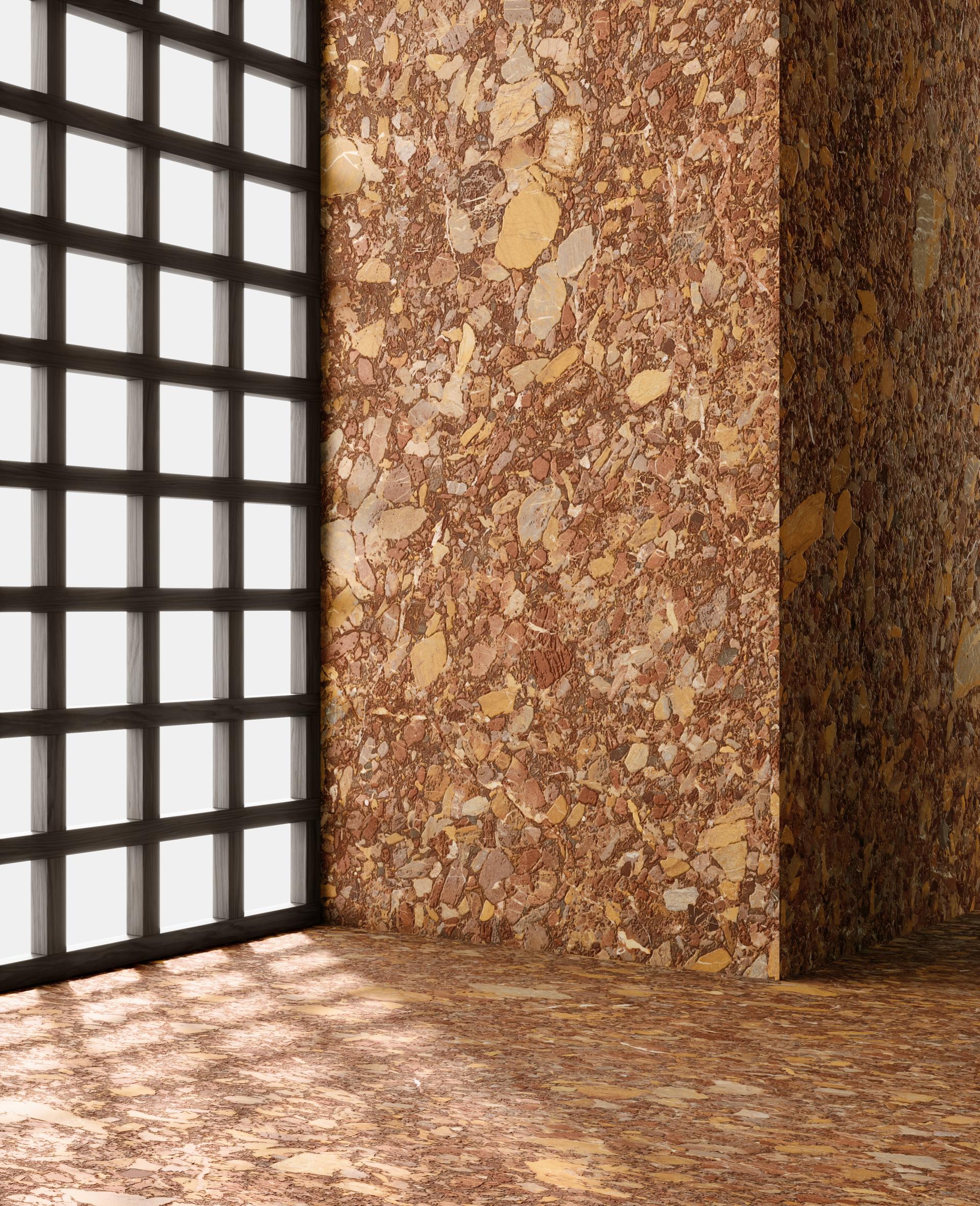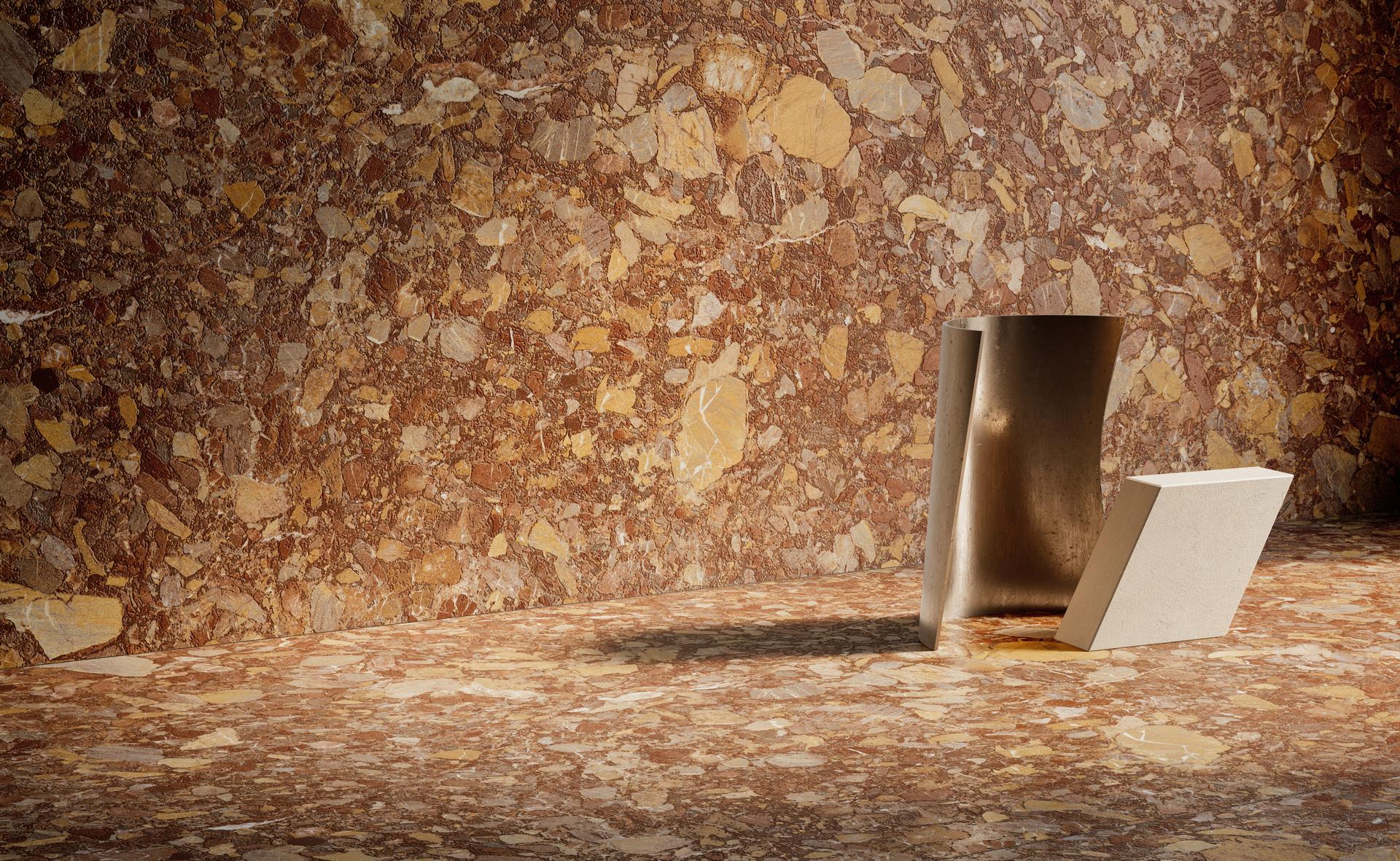 Dinamika воссоздает естественный конгломерат, богатый галькой, обломками и известняковыми кластами, лежащими на красноватом покрытии.