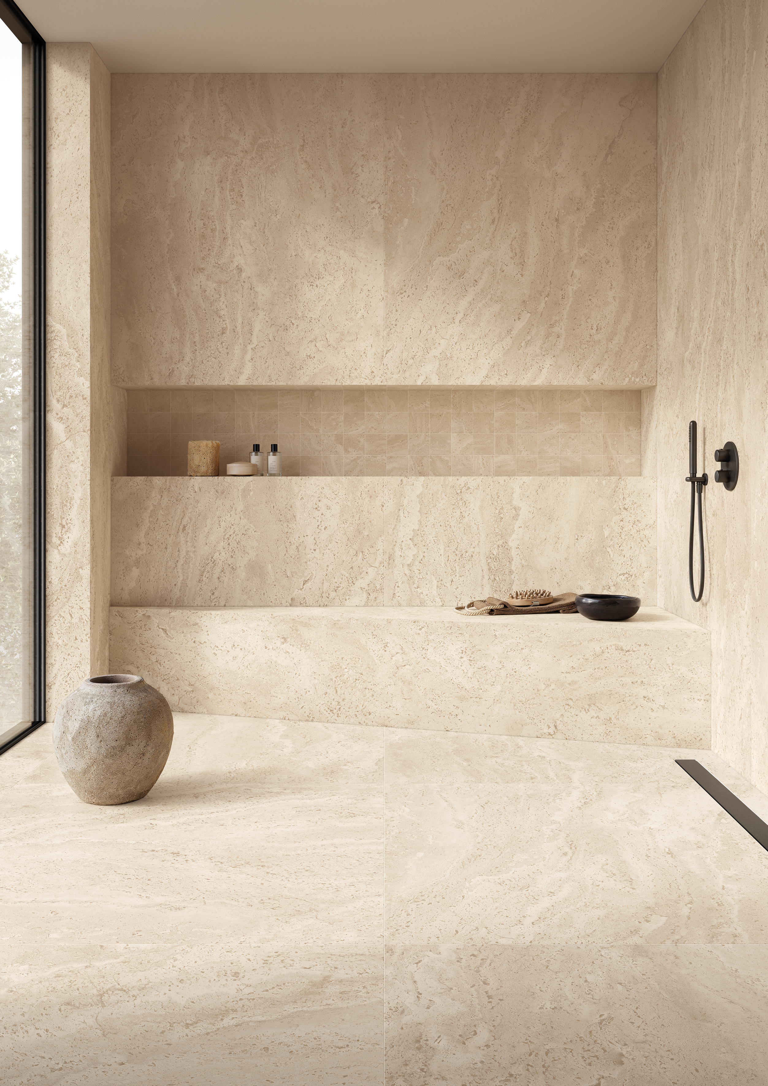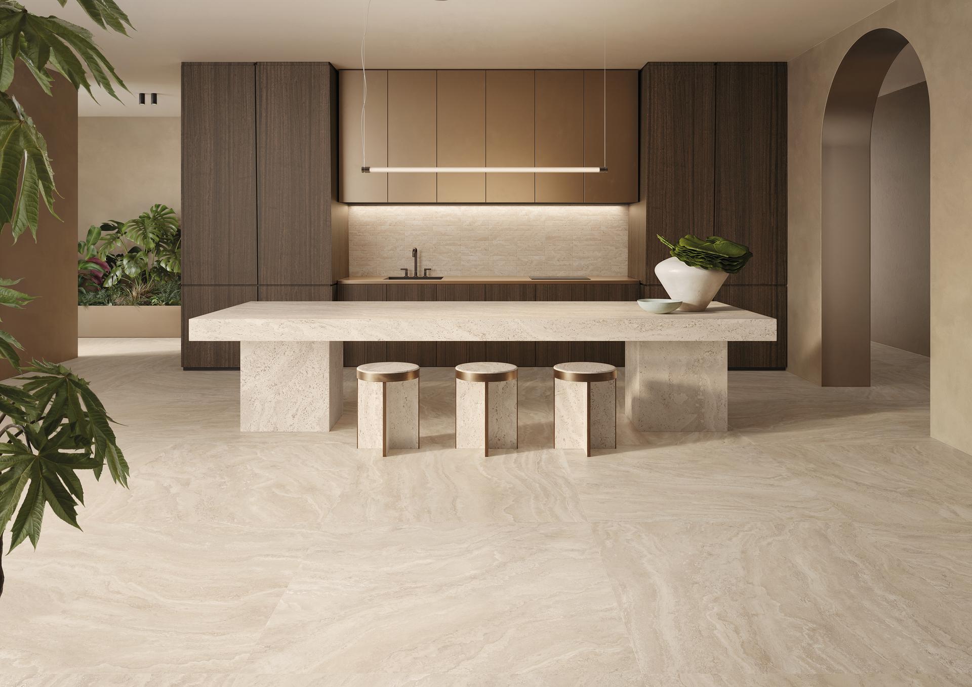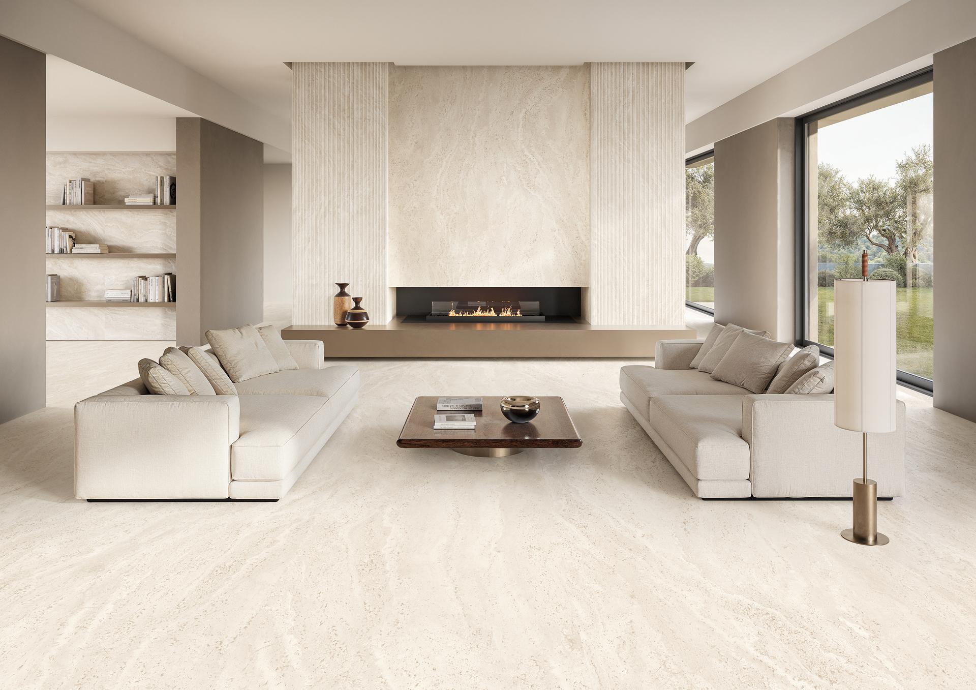 Коллекция представлена в двух вариантах отделки: Poro Aperto, сохраняющая естественные поры камня, и Poro Chiuso, в которой поры заполняются в тон поверхности, создавая более цельную и элегантную фактуру.