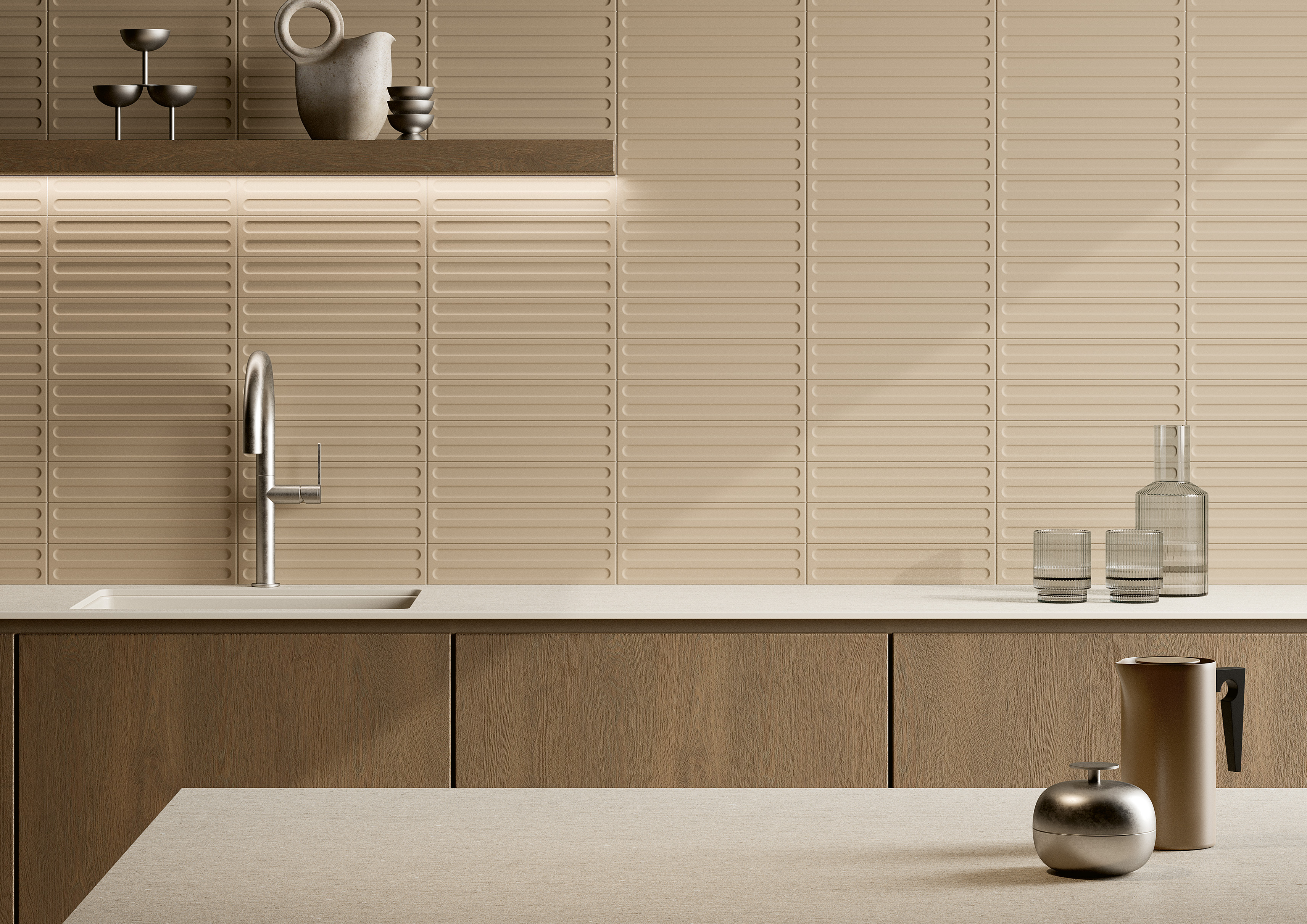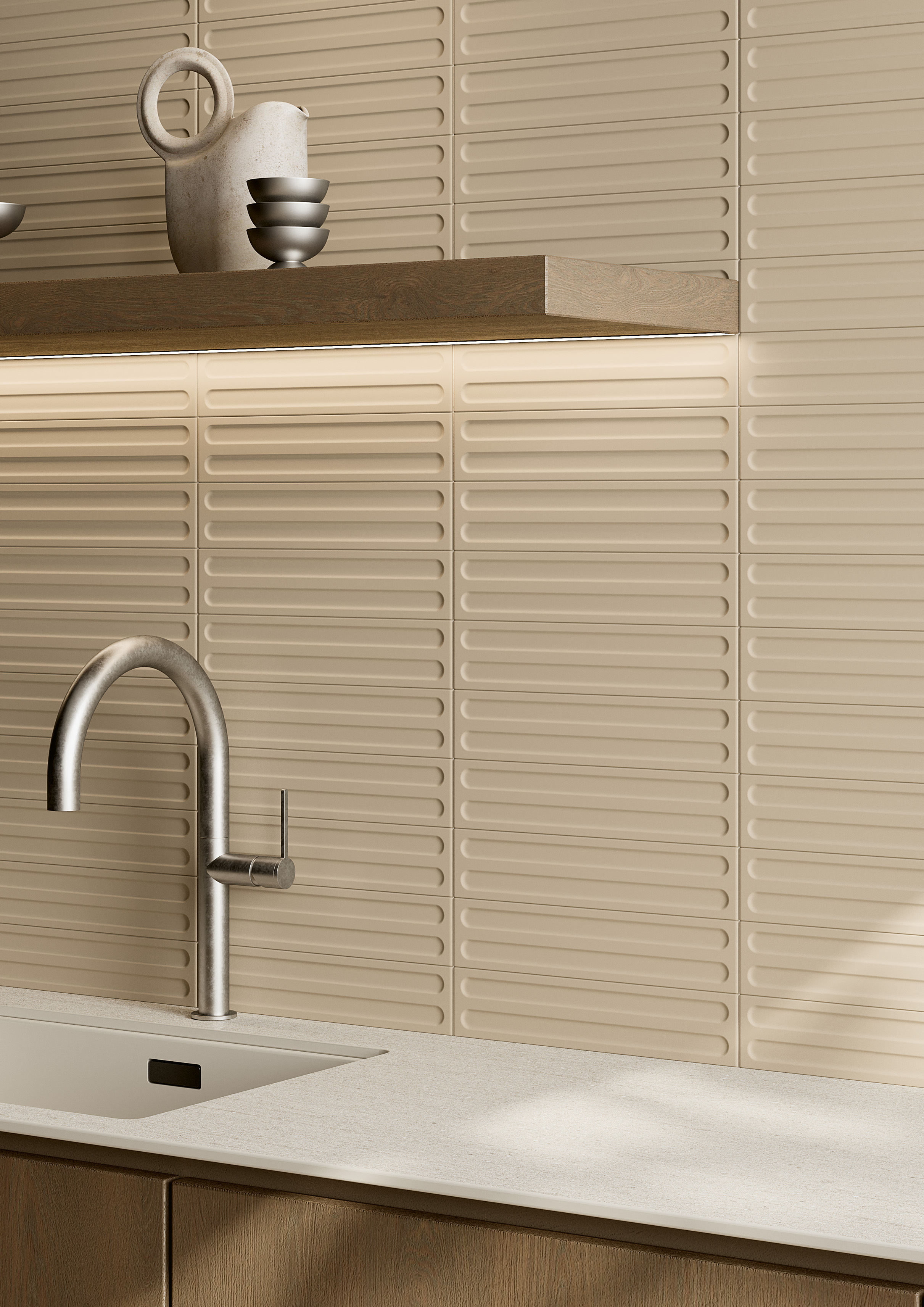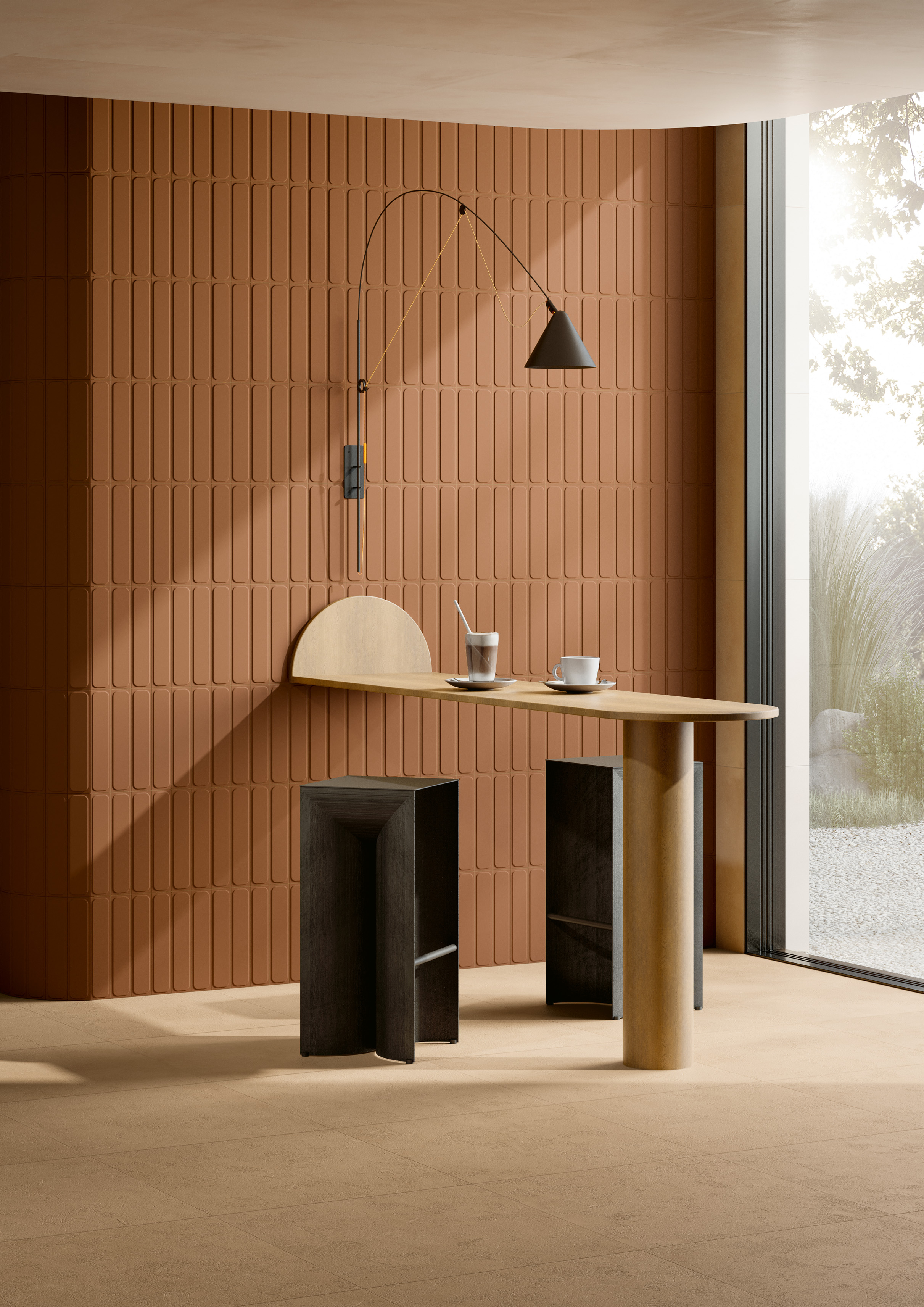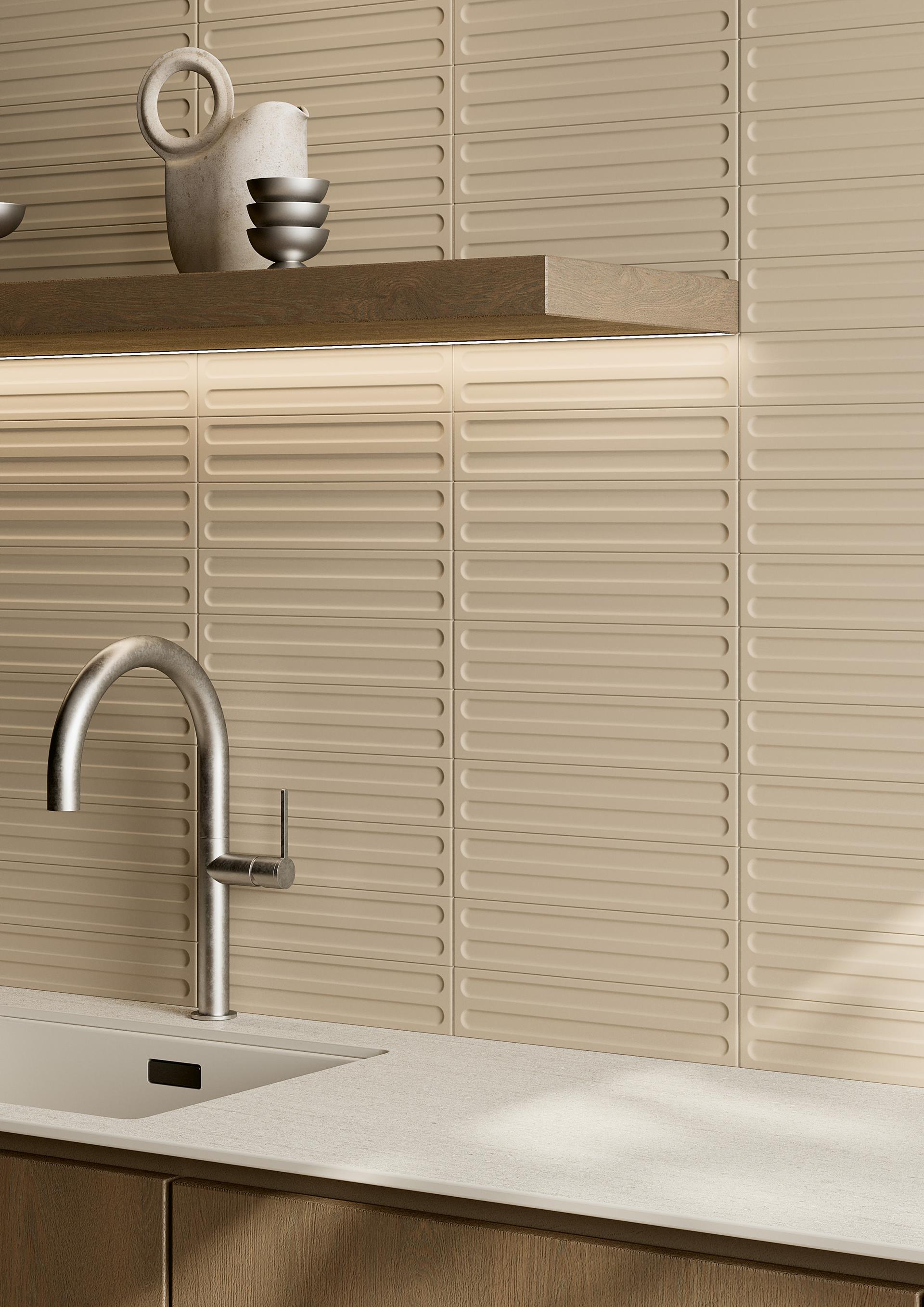 In Tratti, ceramics become movement. Three-dimensional surfaces shape the light, creating soft shadows and velvety hues that enhance spatial perception and create vibrant atmospheres. Sinuous or geometric structures intertwine with deep and neutral tones in a constant dialogue between light and substance. Tratti explores sensory relationships, offering new expressive possibilities for contemporary design.
