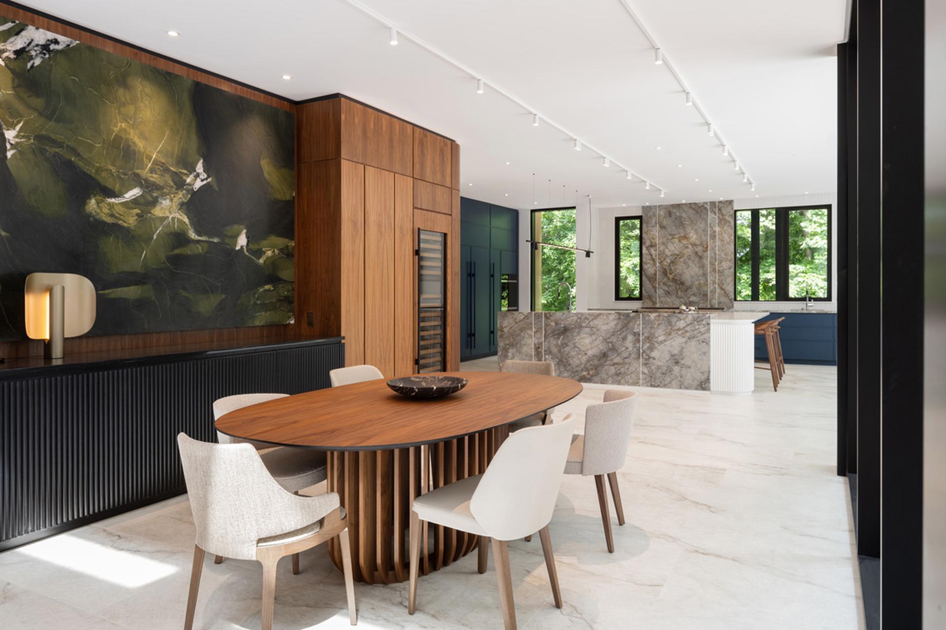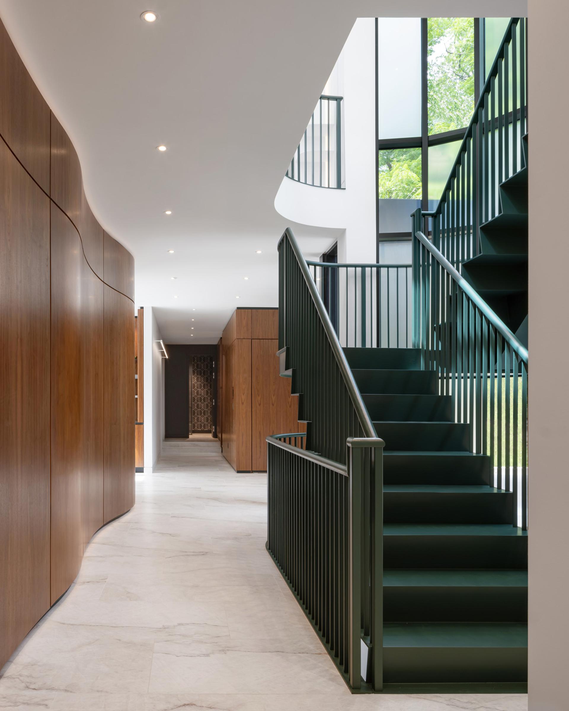 The gentle curves of the north façade, clad in full-height sublimated walnut wood grain aluminium vertical siding, extend out to a curved cantilever on the east side, forming an oval-shaped home office and bedroom above. This sinuous face wraps around two staircases. A green steel staircase, its colour reminiscent of the natural green moss of the forest floor, leads to the private children’s bedroom wing on the second level. A second wood staircase offers a private and intimate experience as it connects directly to the cantilevered master bedroom volume above.
