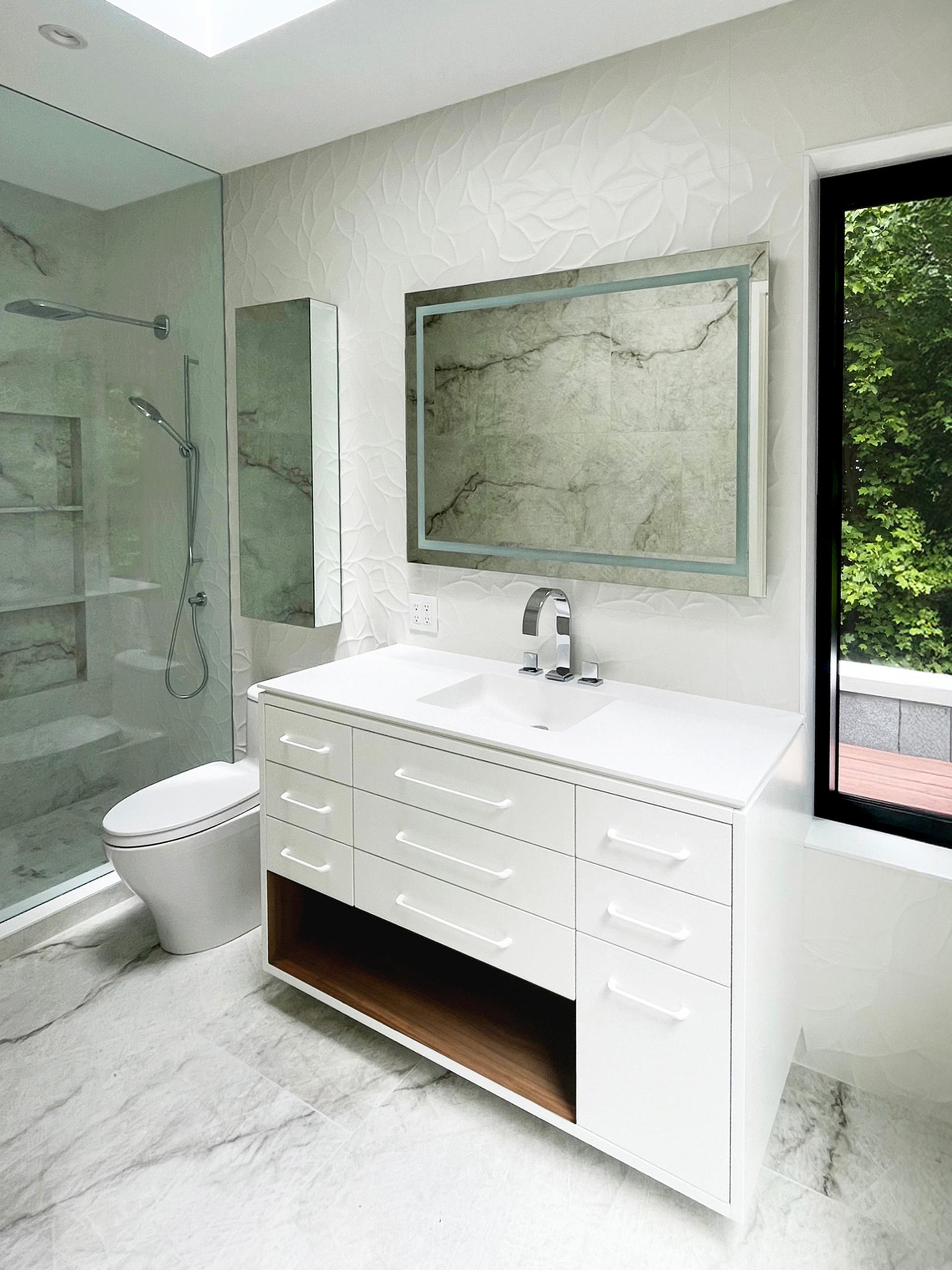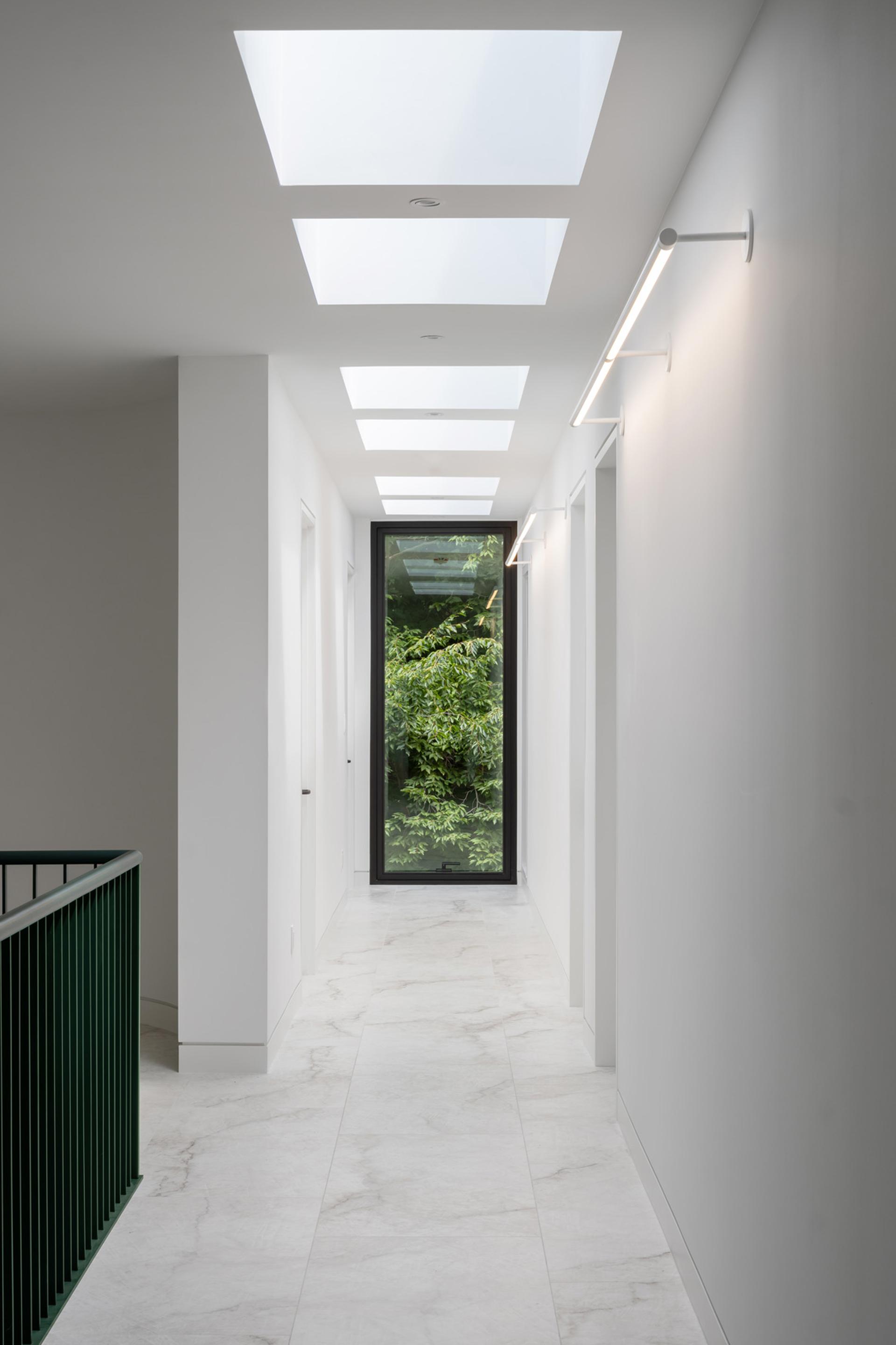 These Architects Inc. has always been highly attentive to the environment. “For this house, reusing the existing foundations saved 306 pounds (139 kg) of CO₂ per cubic metre,” explains Gina Schafrick. “Decarbonisation is part of our design paradigm. But many other elements also contribute to the home’s sustainability: the green roof canopy entrance, large windows for passive ventilation, high-performance glazing for insulation, a heat-recovery ventilation system, a tightly sealed envelope, as well as shutters and shading devices to reduce solar heat gain.”