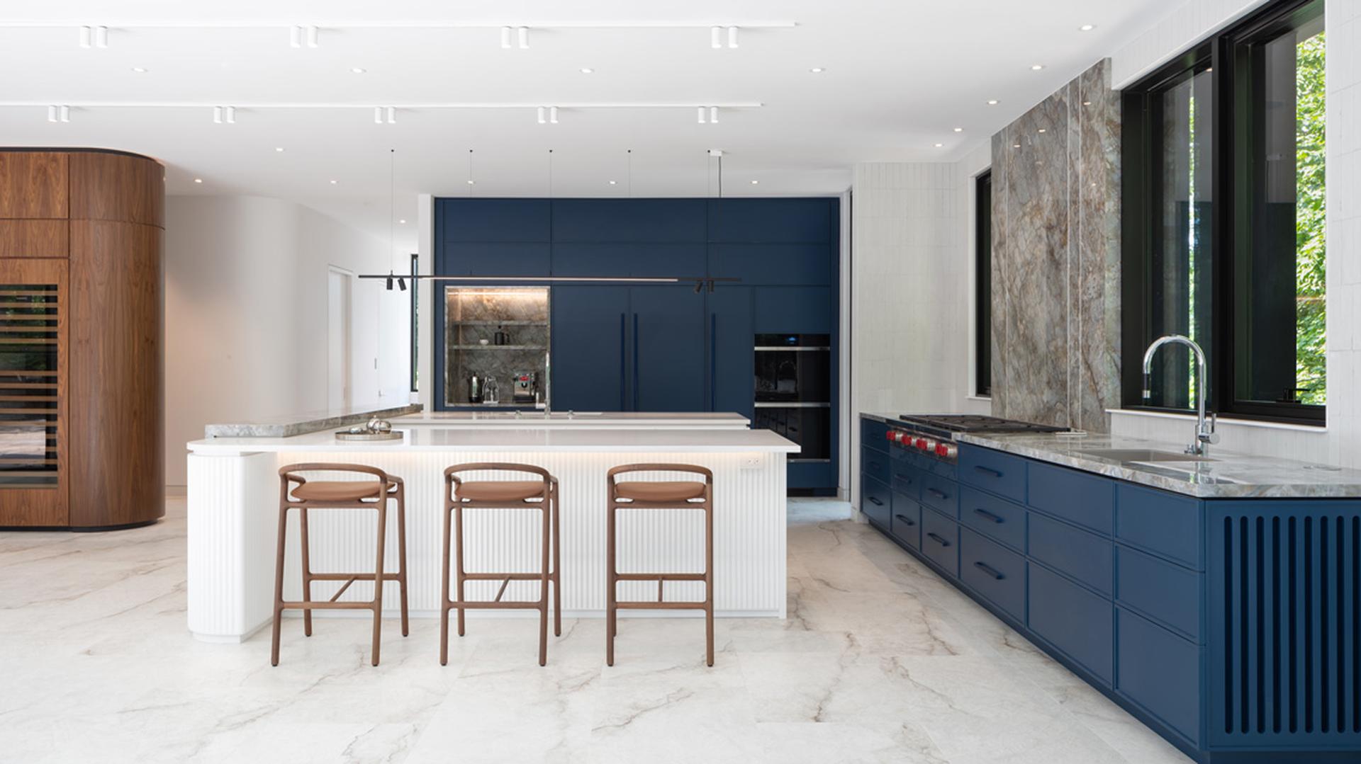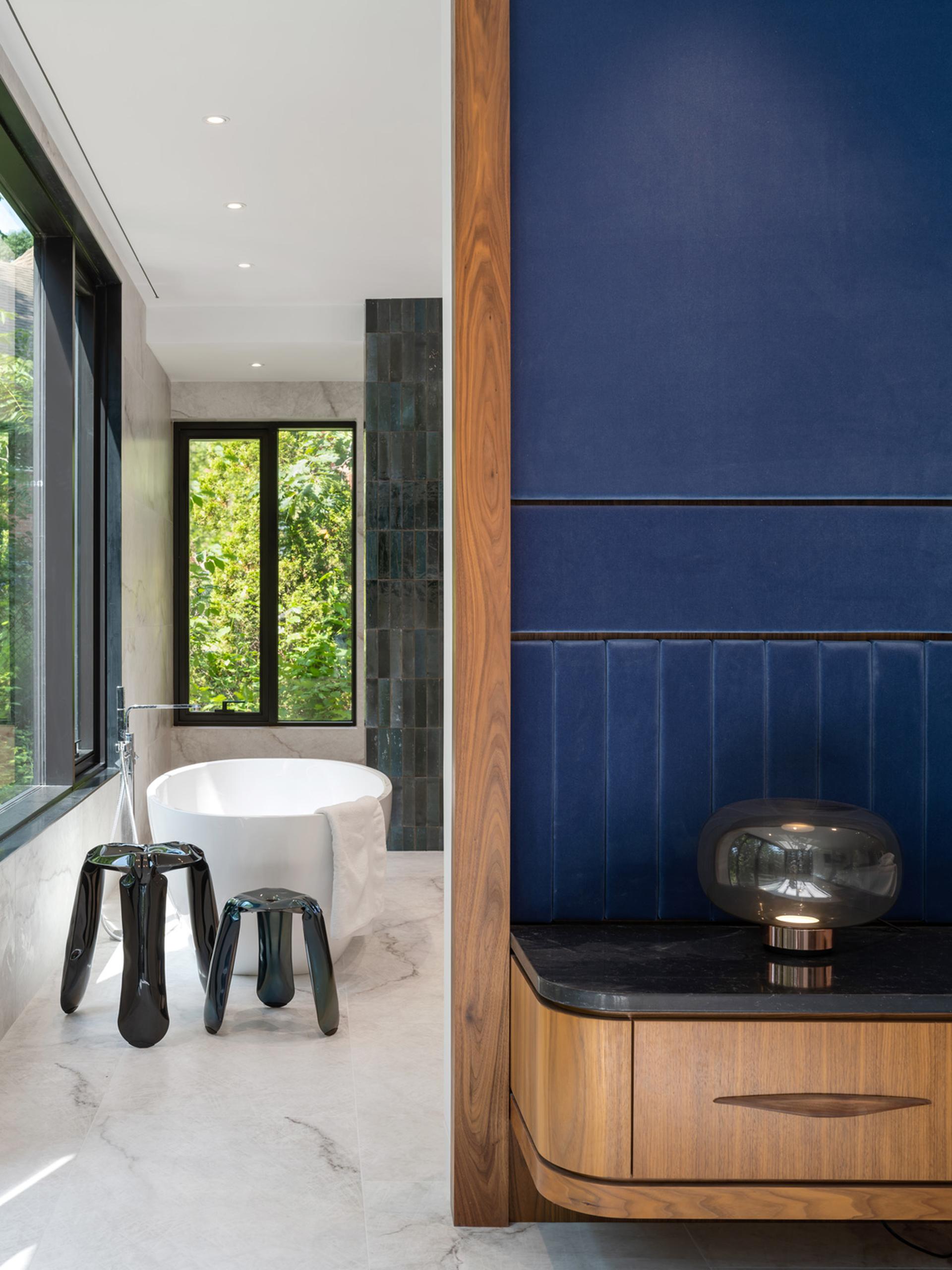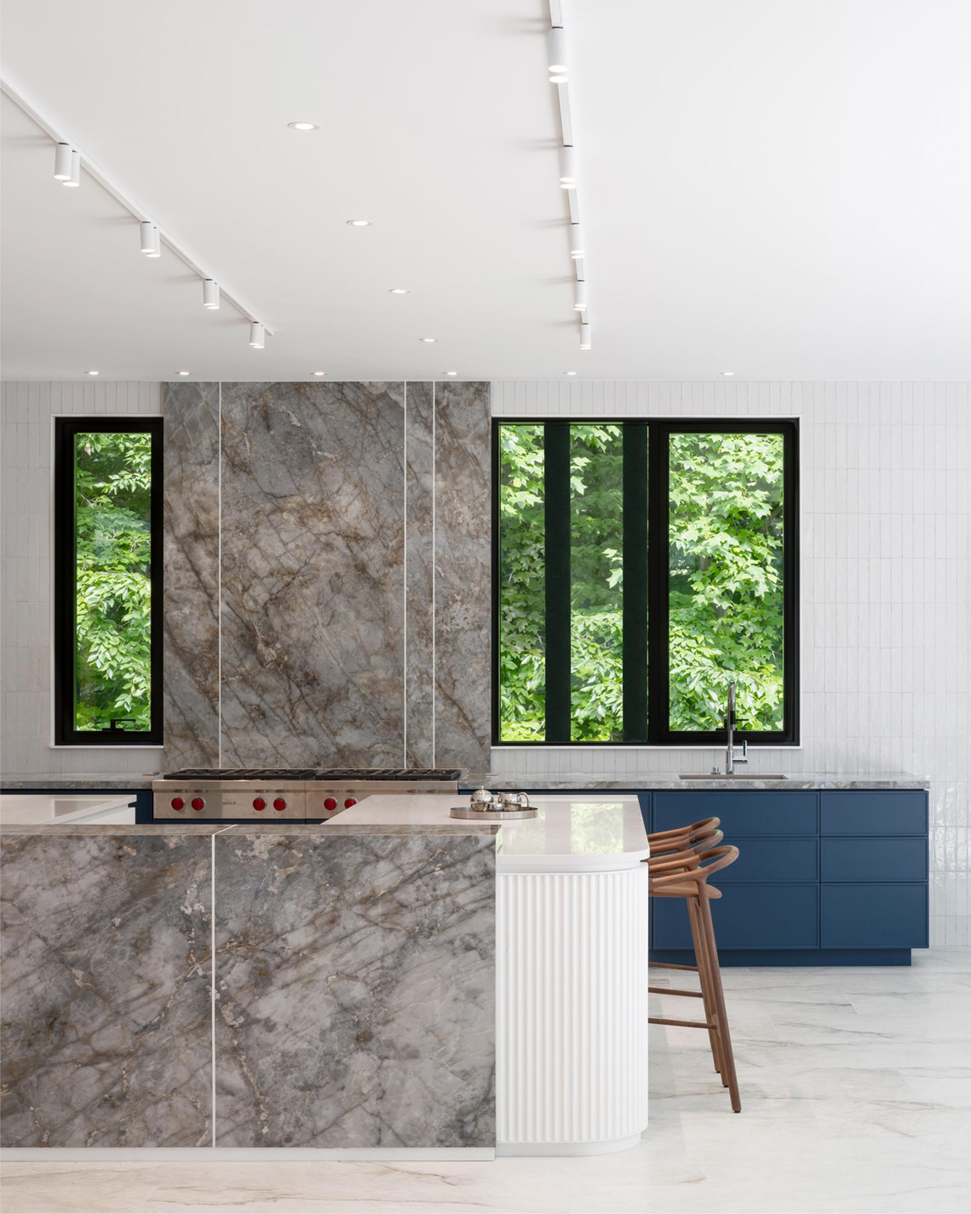 Emilceramica’s Tele di Marmo Reloaded collection, chosen in the colour Quarzo Kandinsky and 60×120 cm size, was used for the floors and several walls, including the showers. The Tele di Marmo Revolution collection, also from Emilceramica, was chosen in the colour Blu Ande for the kitchen countertop, island cabinets, backsplash and bar area, extending to the surfaces in the study.