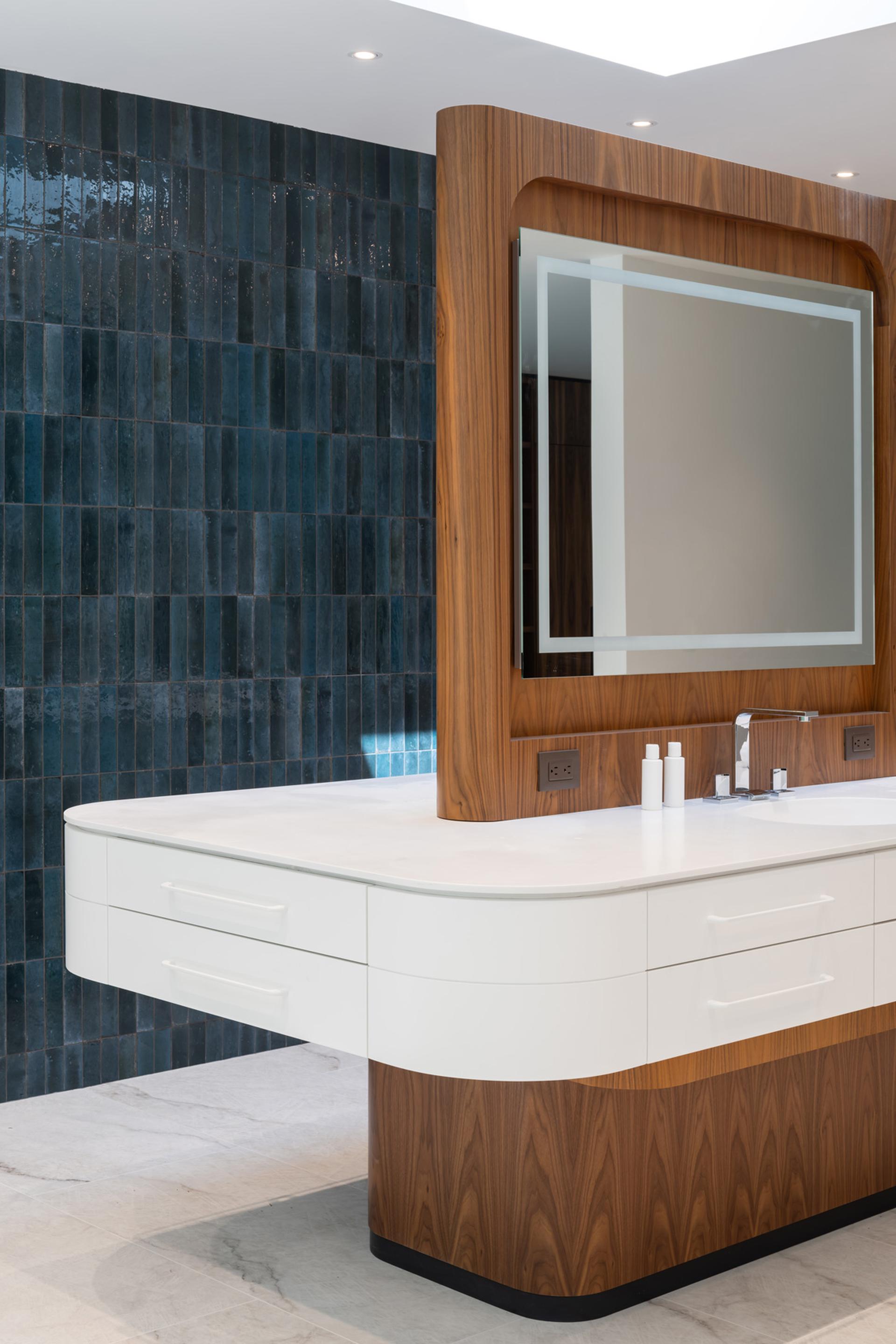 On the same level, the large master bathroom features Marazzi’s Lume brick-format (6×24 cm) tiles in bright White and Blue. This majolica-inspired look continues in the other private bathrooms, where Lume in Green is paired with the brand’s Essenziale White Flora tile with a 3D satin finish (40×120 cm).