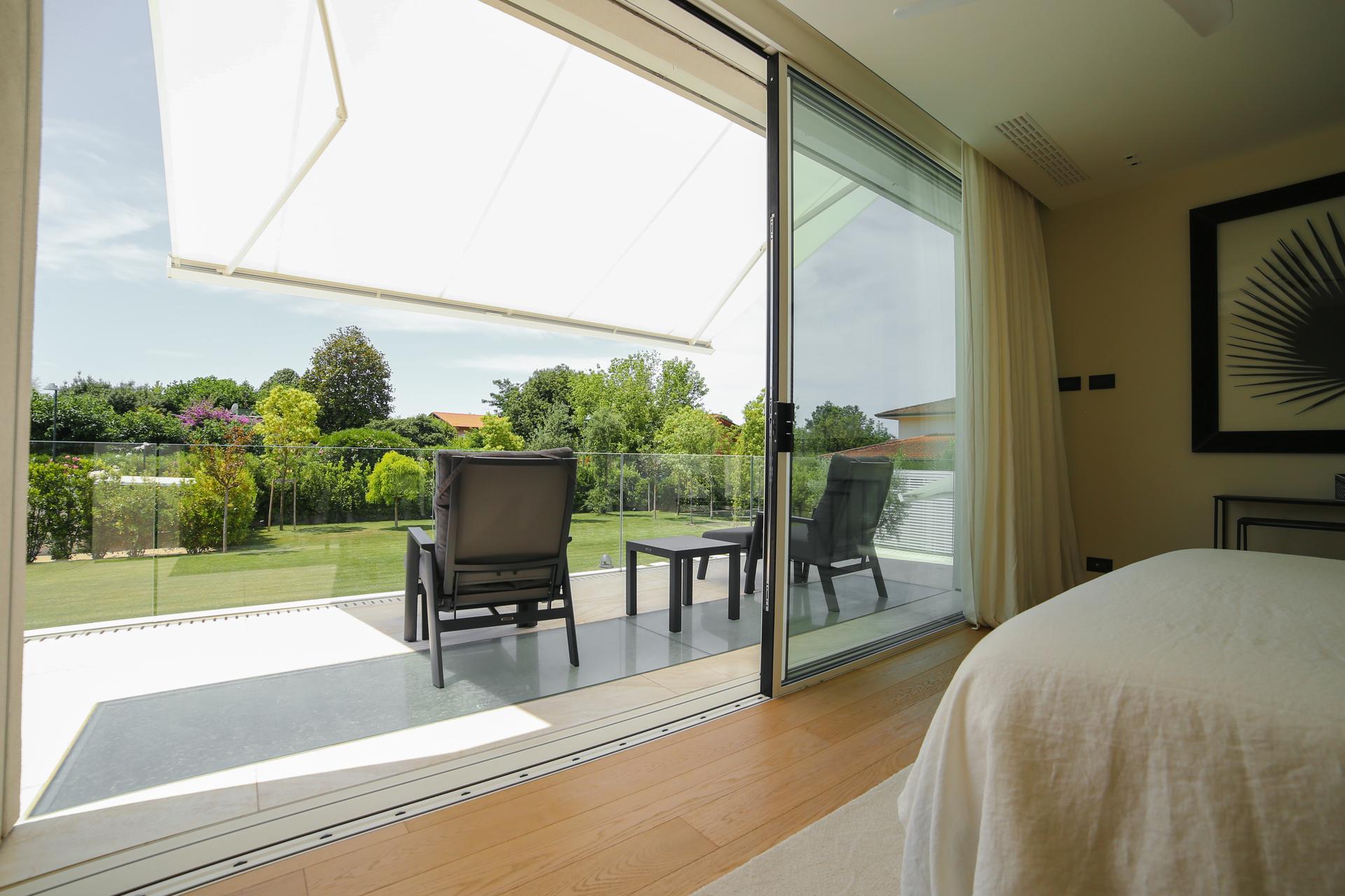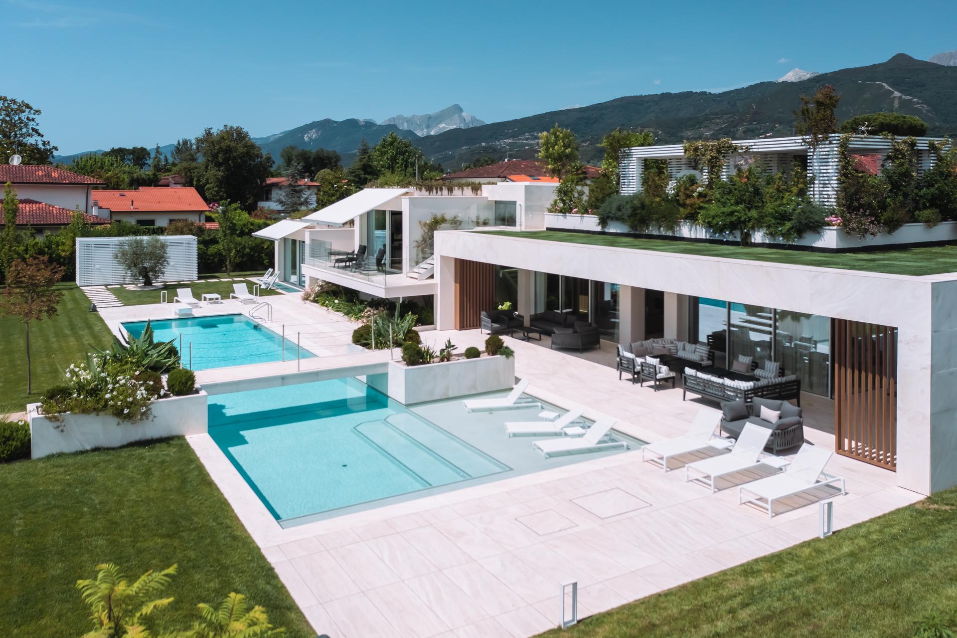 The view from the villa’s large glass windows is truly breathtaking, stretching from the lush vegetation of this natural amphitheatre – its green slopes streaked with the white of Carrara marble – down to the beaches of the Tyrrhenian Sea.