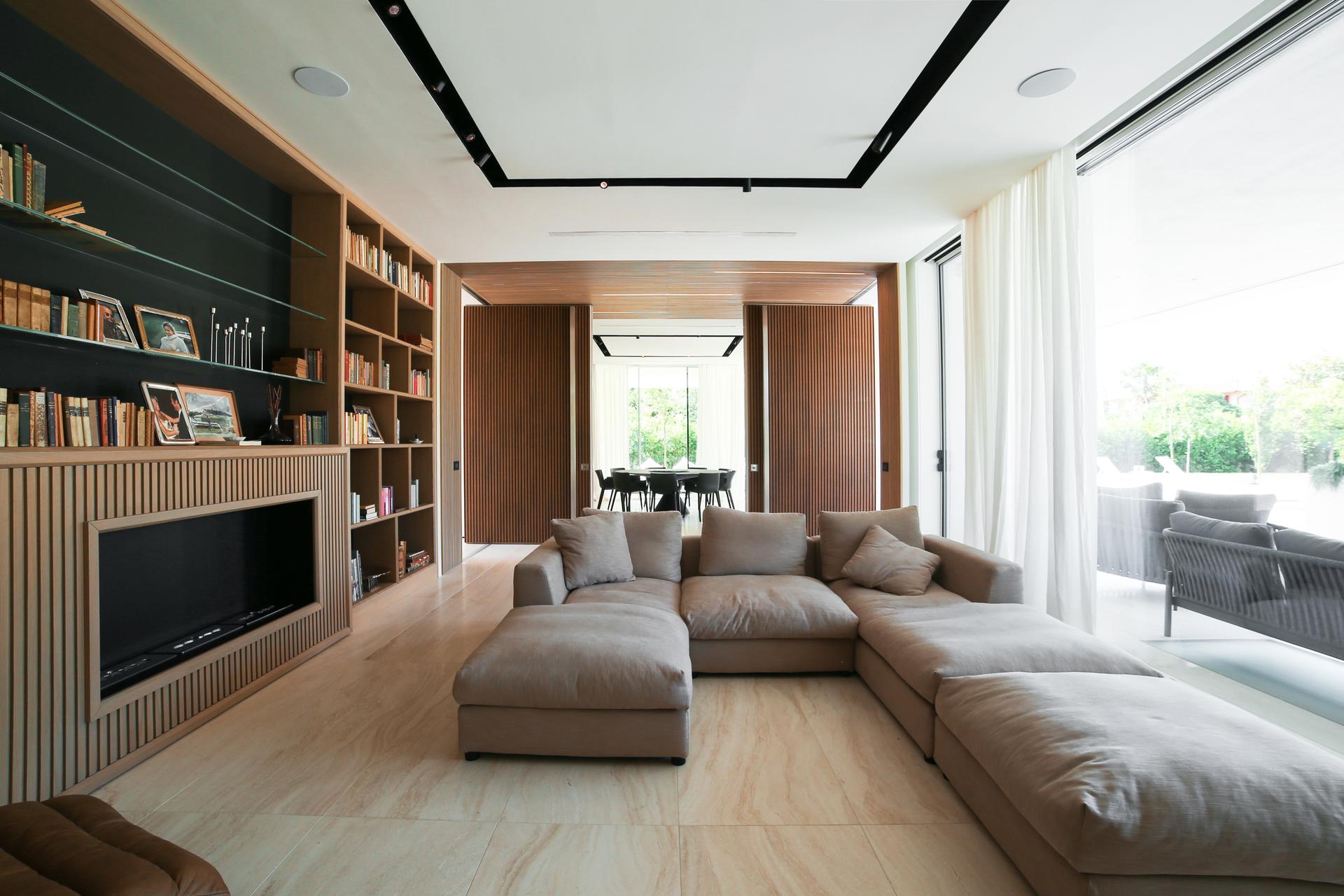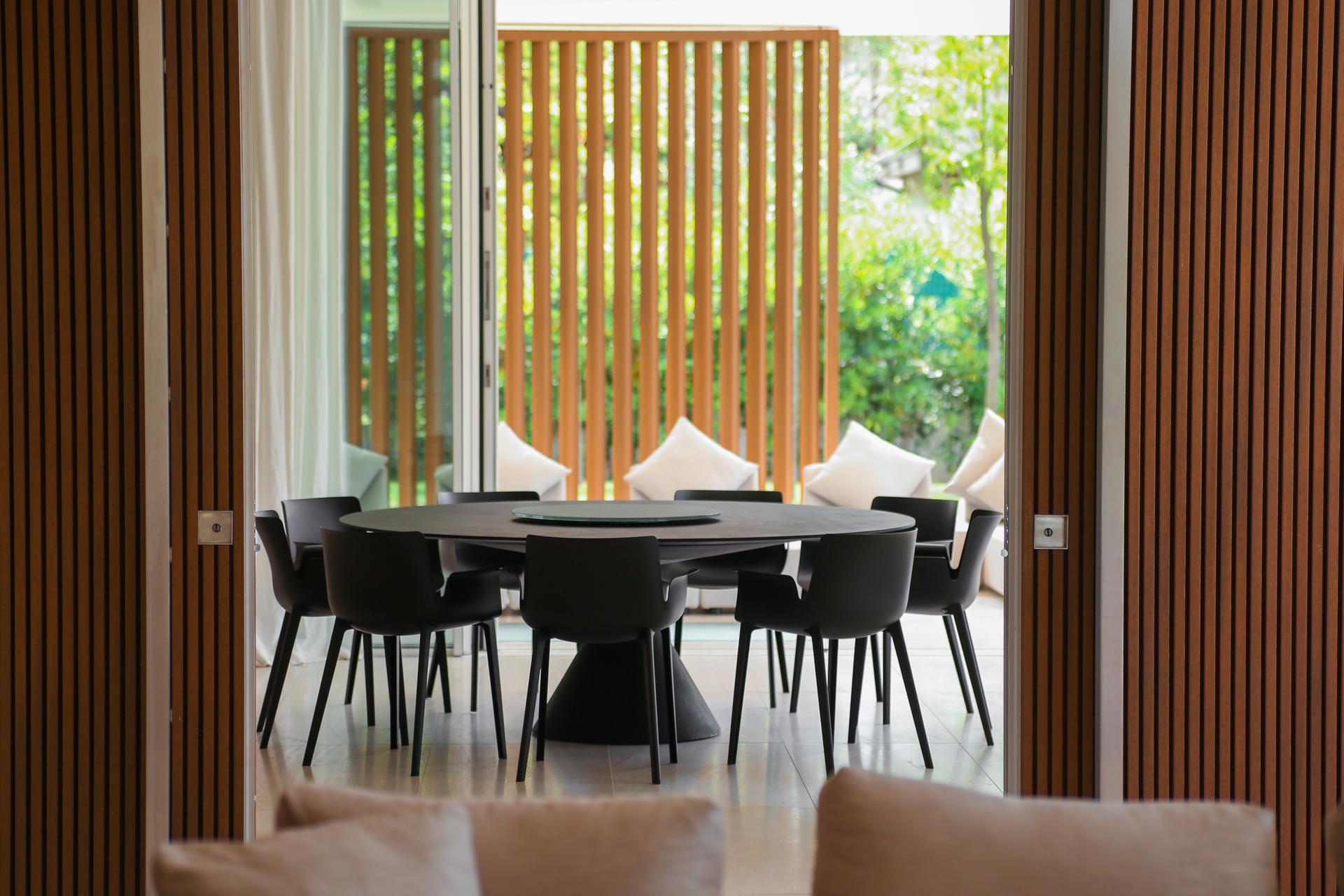 The layout centres on the living area, while the sleeping quarters form a series of rectangular clusters of five suites. Both zones overlook a large swimming pool with a shallow sunbathing area and a deeper section for swimming.