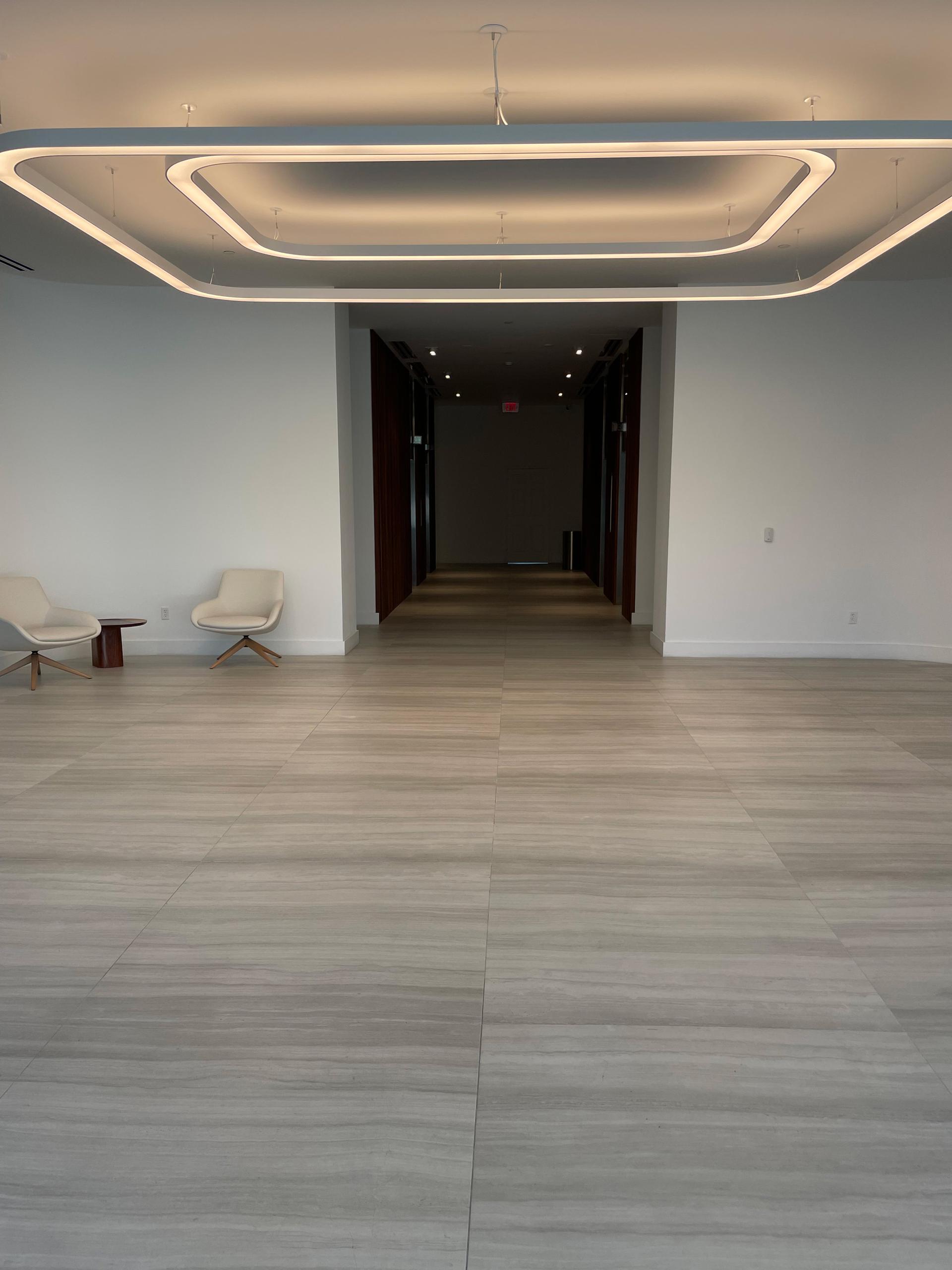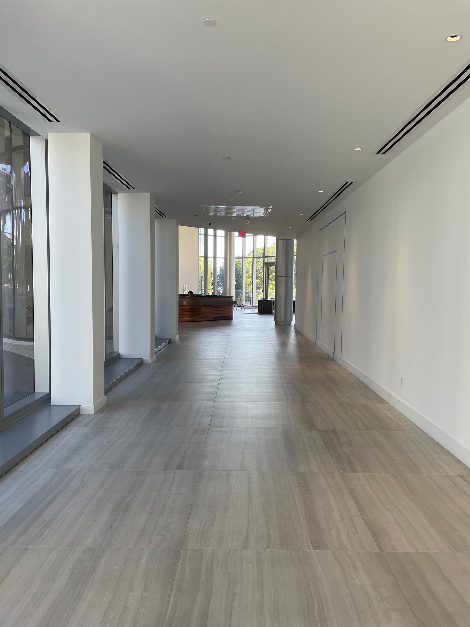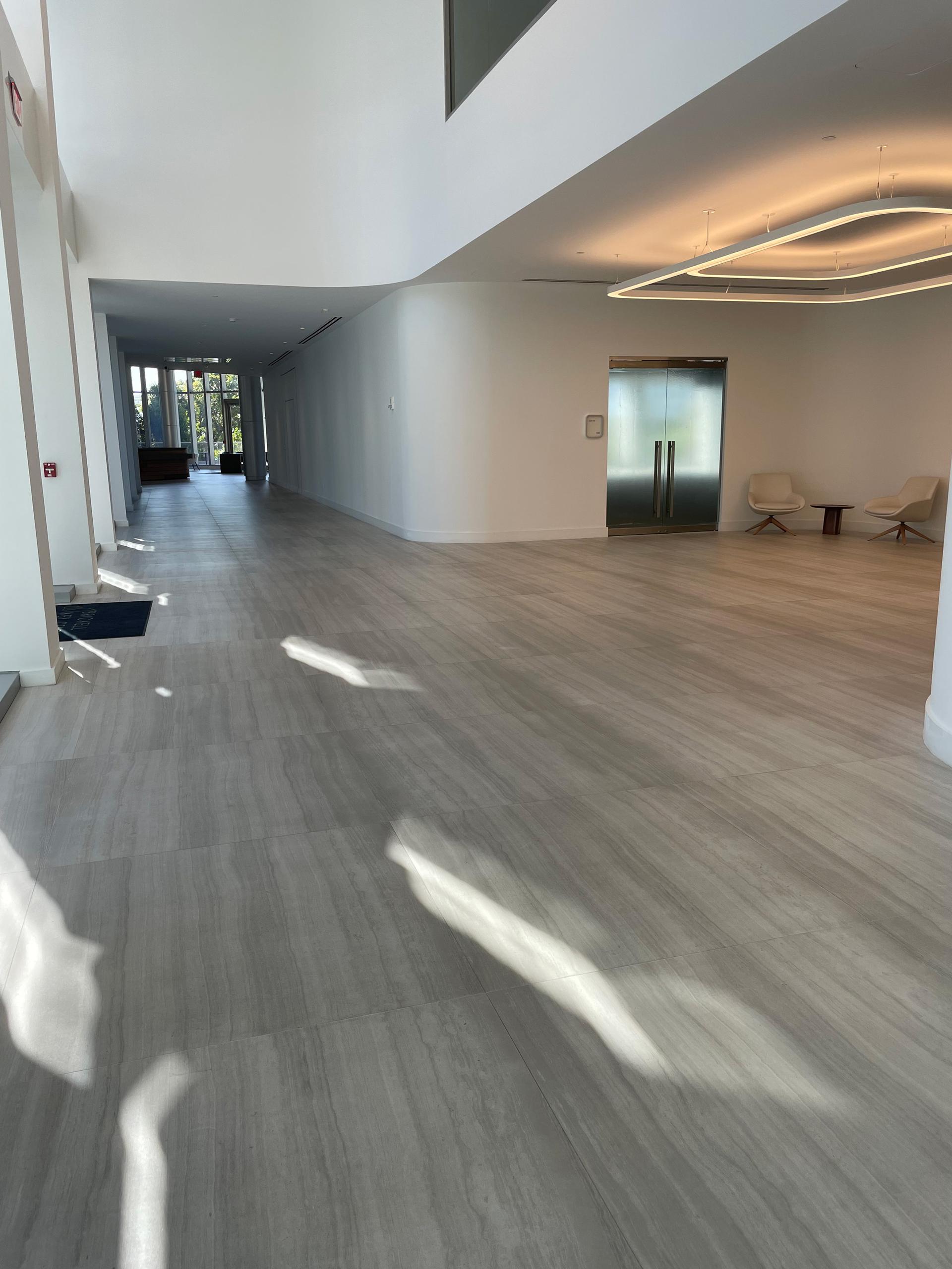 Inside, the new main hall serves to connect the building’s towers. “It is a transition space that offers views of the bay while creating an atmosphere of calm and sophistication, a ceremonial passageway that also functions as an immersive gallery. Here we chose Coem’s Flow ceramic tile collection in Light Grey. Its fluid veining and soft tonal variations create a sense of movement and depth, reflecting the waters of the bay. We used ceramic tiles on the floor to unify the spatial experience, and on selected walls to create a sense of continuity and permanence. The matt finish minimises glare, ensuring both comfort and optimal conditions for displaying art. The Italian ceramic tiles are not only highly durable but also reflect the cosmopolitan character of the building’s international tenants.”