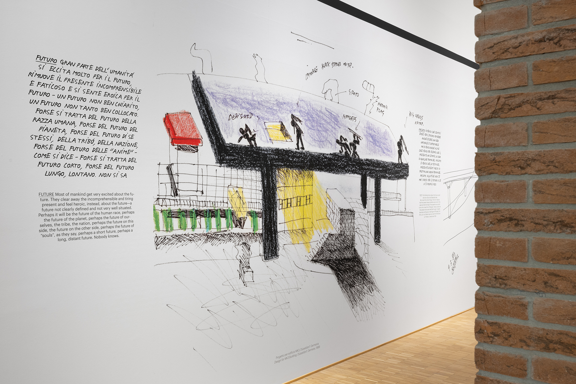 La mostra riunisce disegni e schizzi di Sottsass legati ai temi dell’architettura, del paesaggio e delle rovine, che vanno a comporre un racconto visivo di grande formato sulle pareti perimetrali di Sala Sottsass. Per avvicinare i visitatori al pensiero di Sottsass sull’architettura si è scelto di privilegiare alcuni disegni del periodo successivo a Memphis e un testo del 1992 intitolato Rovine. Alcuni brani di questo testo accompagnano a parete gli ingrandimenti dei disegni, insieme ad altre riflessioni di Sottsass che fanno emergere la sua volontà di privilegiare nella progettazione “la parte che si abita rispetto a quella che si vede”.